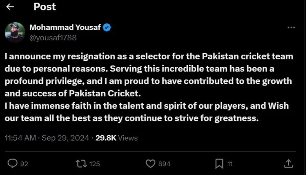 محمد یوسف نے مائیکرو بلاگنگ ویب سائٹ ایکس پر مستعفی ہونے کا اعلان کیا اور کہا کہ وہ ذاتی وجوہات کی بنا پر پاکستان کرکٹ ٹیم کے سلیکشن کمیٹی سے مستعفیٰ ہورہے ہیں۔